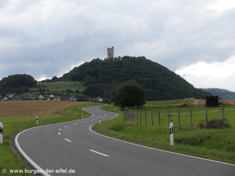 Von Westen kommend die B412 nehmen. In der Nähe von Kempenich die Ausfahrt Mayen/Kempenich/.../Niederzissen nehmen und dann rechts auf die L83 (Richtung Hannebach) abbiegen. In Hannebach rechts in die L111 nach Niederdürenbach abbiegen. In Niederdürennach zunächst auf der L111/Brohltalstraße bleiben. In Oberzissen nach rechts in die Burgstraße abbiegen und dann nach ca. 90 m rechtshalten und weiter auf der Burgstraße (K51). In Hain zunächst weiter auf der Dorfstraße und ab nun der Beschilderung zur Burg folgen.