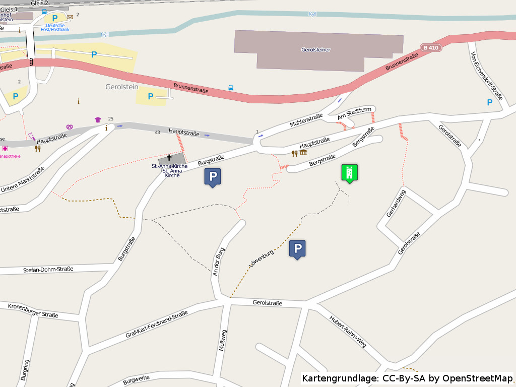 Die Etappe 9 des Eifelsteigs endet bzw, die Etappe 10 beginnt in Gerolstein. Die Etappe 10 führt fast direkt an der Löwenburg vorbei.