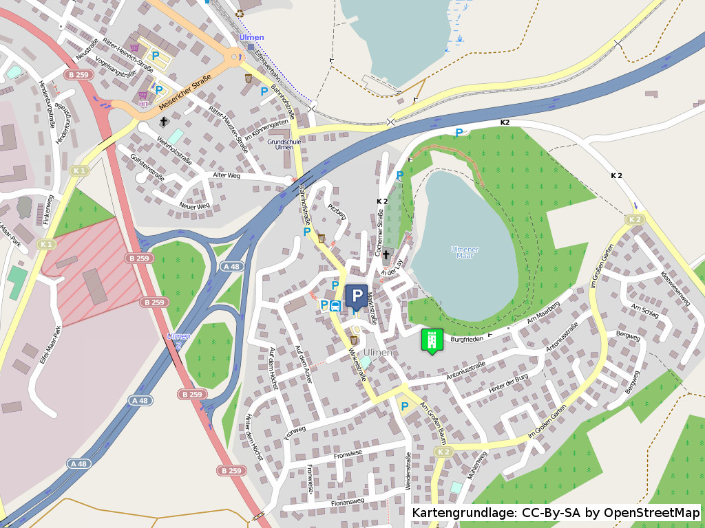 | Weitere Informationen: | Die Ulmer Burgen bestanden ursprünglich aus der älteren Oberburg und der ca. 200 Jahre später errichteten Niederburg (auch Unterburg genannt). Auf dem Gelände der Oberburg finden regelmäßig Veranstaltungen statt. Von der Oberburg hat man u.a eine gute Ausicht auf das direkt unterhalb der Burg liegende Ulmener Maar. |