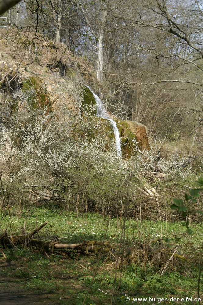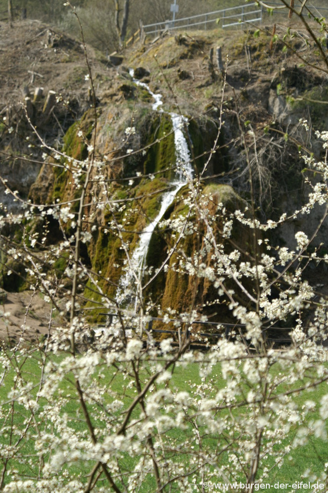 Der Eifelsteig führt direkt oberhalb des Wasserfalls auf dem ehemaligem Bahndamm vorbei. Die Stelle ist gut zu erkennen, da hier ein Teil des Wassers direkt über den Weg fließt.